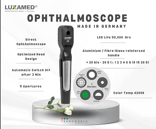 - Direct ophthalmoscope in a handy pocket size, Correction range: + 20 to - 20 D (± 1 2 3 4 6 8 10 15 20 D)