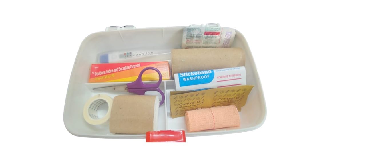 Complete first aid box equipped with essential medical supplies for emergency situations and basic medical care
