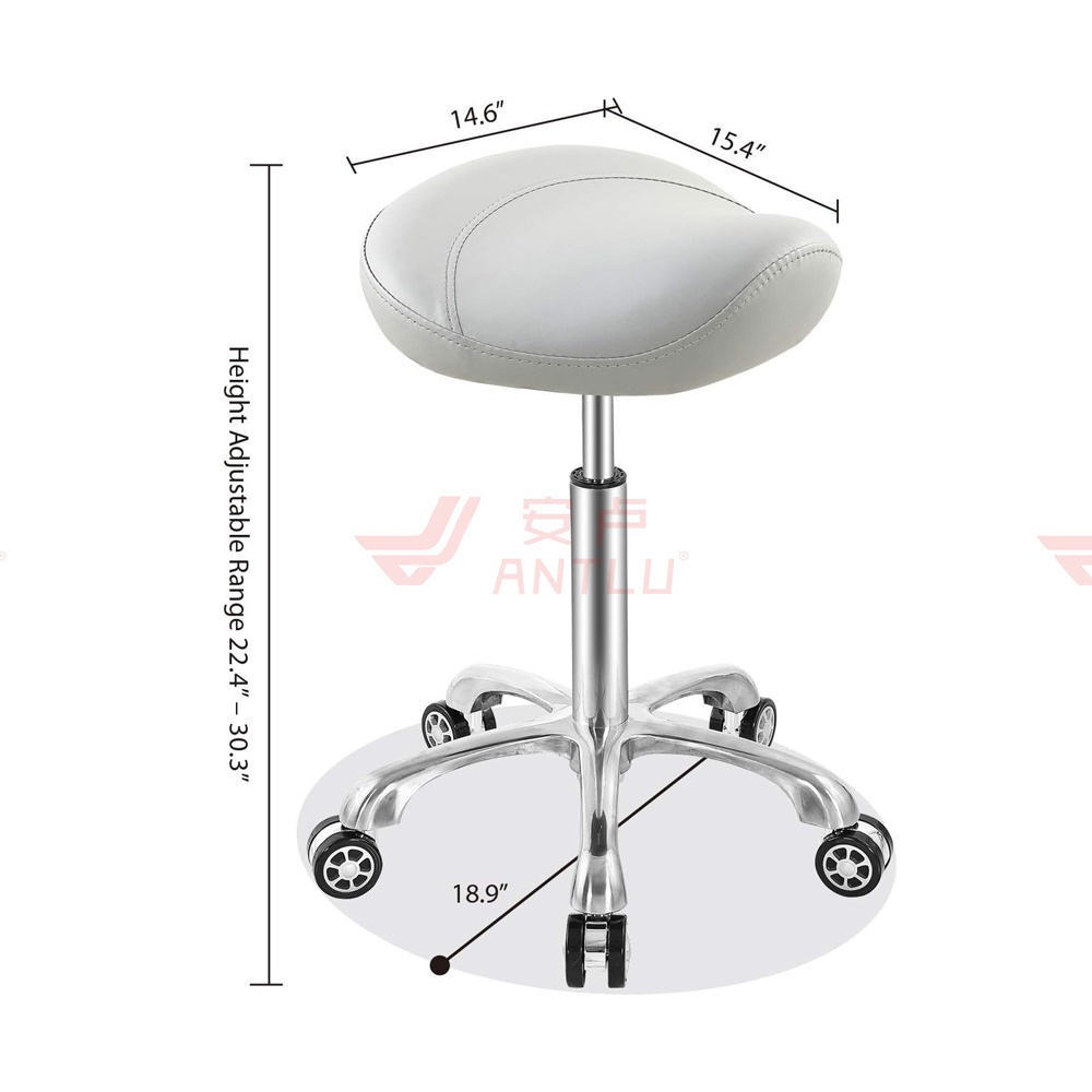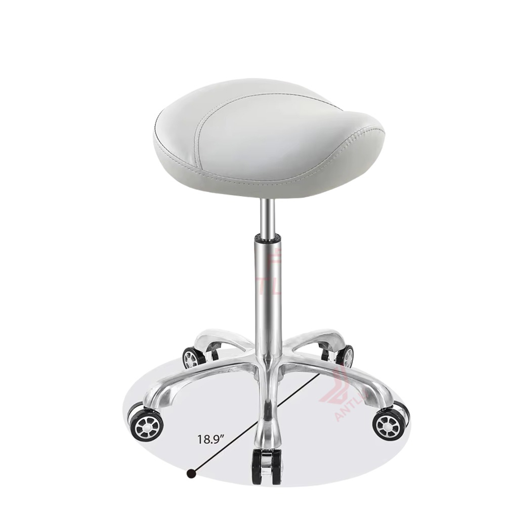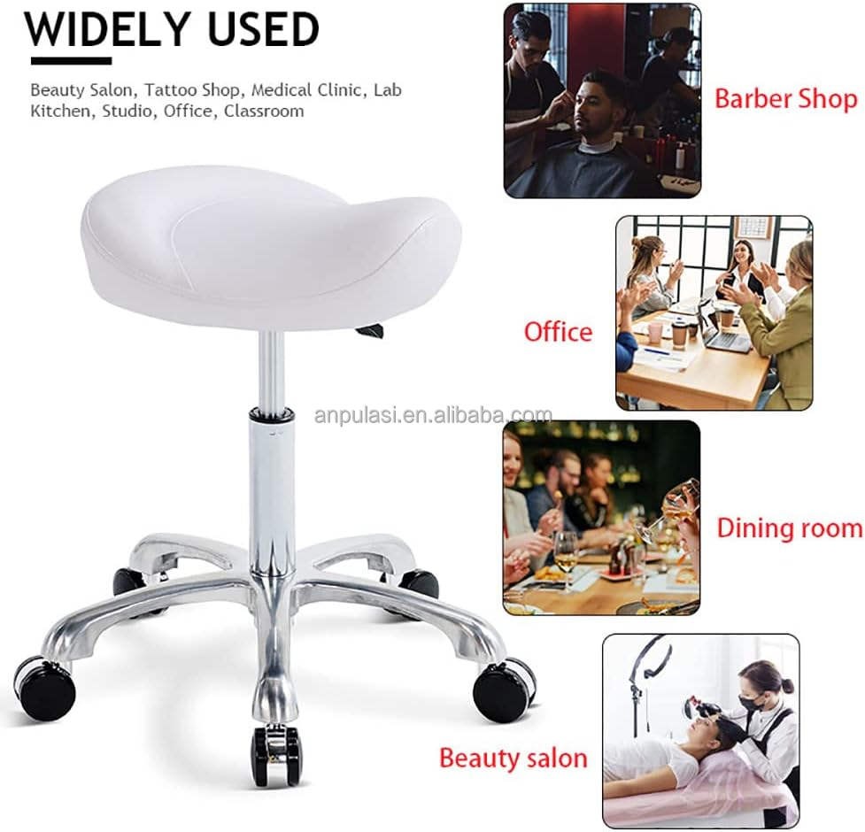 Feature highlights: This TeknoWorth Ergonomic Rolling Swivel Saddle Stool combines modern design with functionality, featuring 360-degree swivel, adjustable height, and a Class 3 gas lift. It is ideal for commercial use in dental offices, hospitals, and salons, offering durability and comfort with synthetic leather fabric. Available in black, white, or brown.